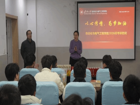为缓解考研学子备考压力,传递学院的关怀与温暖,11月21日,济南大学自动化与电气工程学院在第一教学楼地下报告厅举办2026届考研慰问活动。学院党委副书记、副院长张琦,2022级辅导员赵芳出席活动。