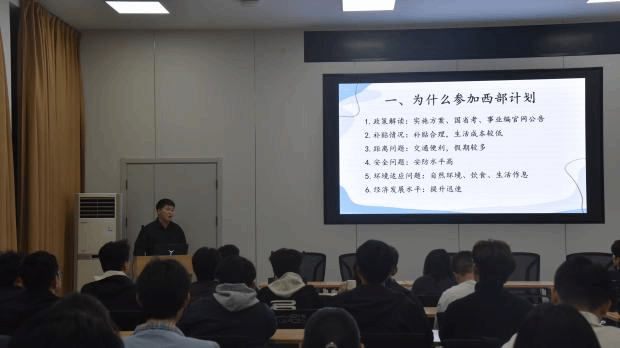 宣讲现场氛围热烈,三位志愿者用真实的经历、鲜活的故事,全面介绍了西部计划政策保障、服务内容、报考流程与未来发展前景,还细致解答了同学们关于岗位选择、生活保障、职业规划等方面的疑问,让在场同学对西部计划有了更直观、更深入、更全面的认识。