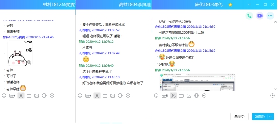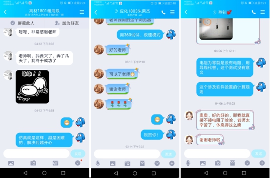 经过老师与同学们的共同努力,除因客观条件限制无法进行虚拟实验的同学,大部分同学基本掌握了虚拟软件的简单使用,为后续复杂项目的开展打下了良好基础。在这个过程中,涌现出大批掌握较好的热心同学,活跃于QQ群,经常对其他同学提出问题的进行“技术支持”,不仅增进了不同学院和专业的同学之间的交流,还大大减轻了老师的答疑压力,例如化工1802班张增胤同学、机工1803班张荣成同学、材料1809班林巧雯同学、材料1814班张洁同学、车辆1801班刘雪同学、高材1803班刘雪同学、高材1805班尚永蔚同学等等,他们用更接地气的语言向同学描述着各种操作,为学习群营造了轻松的氛围。