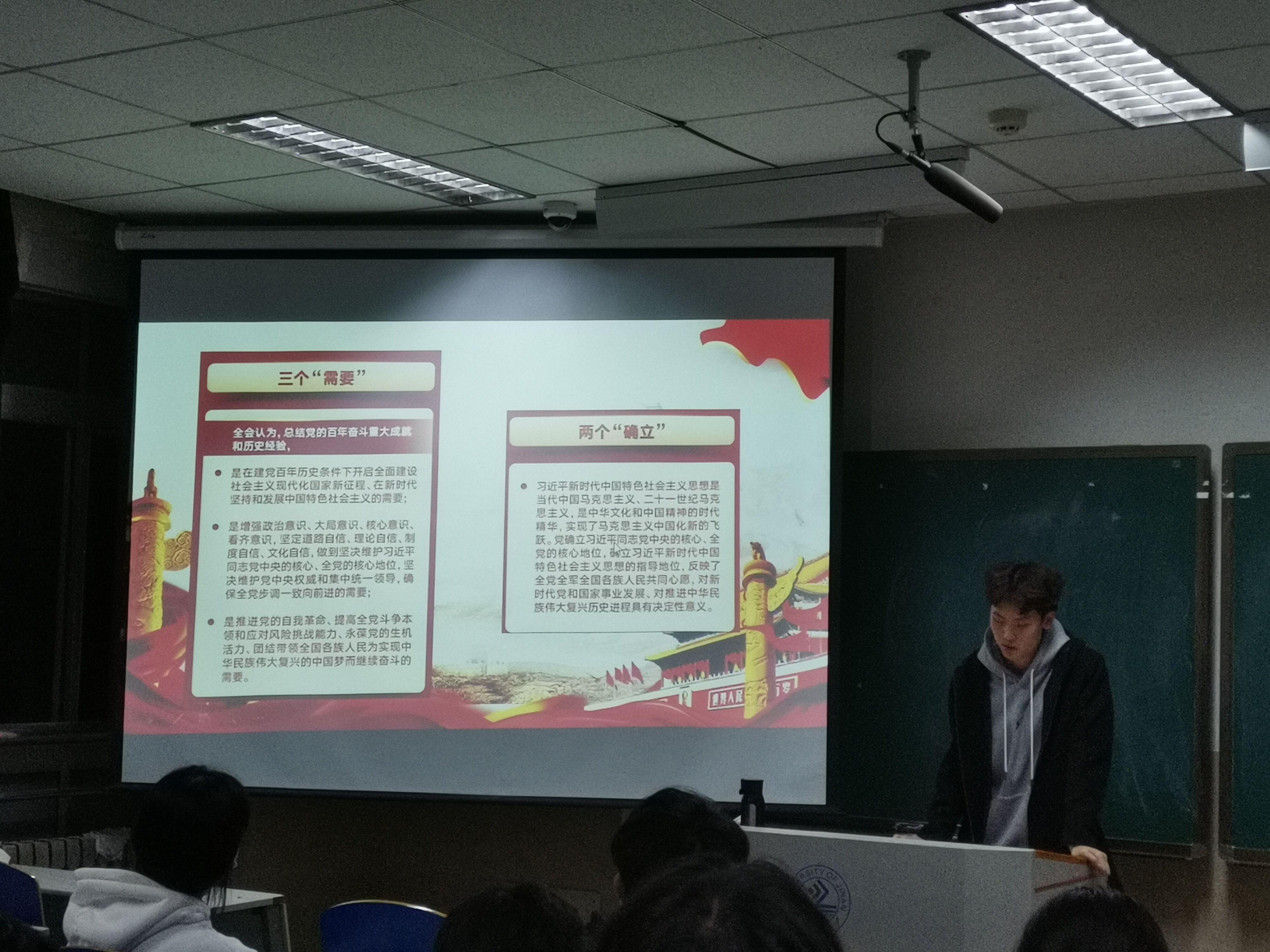 学生会团支部在第一教学楼203教室集体学习了《中共中央关于党的百年奋斗重大成就和历史经验的决议》和习近平总书记在会上的重要讲话,开展关于十九届六中全会精神的学习交流。学生会团支部书记李振表示,百年辉煌成就的取得,不仅使中华民族伟大复兴进入了不可逆转的历史进程,还创造了中国式现代化新道路,创造了人类文明新形态,为人类文明作出了新的巨大贡献。作为当代青年的我们要有责任意识,肩负起时代赋予我们的使命,努力学习科学文化知识,坚定理想信念,为民族复兴而不懈努力。