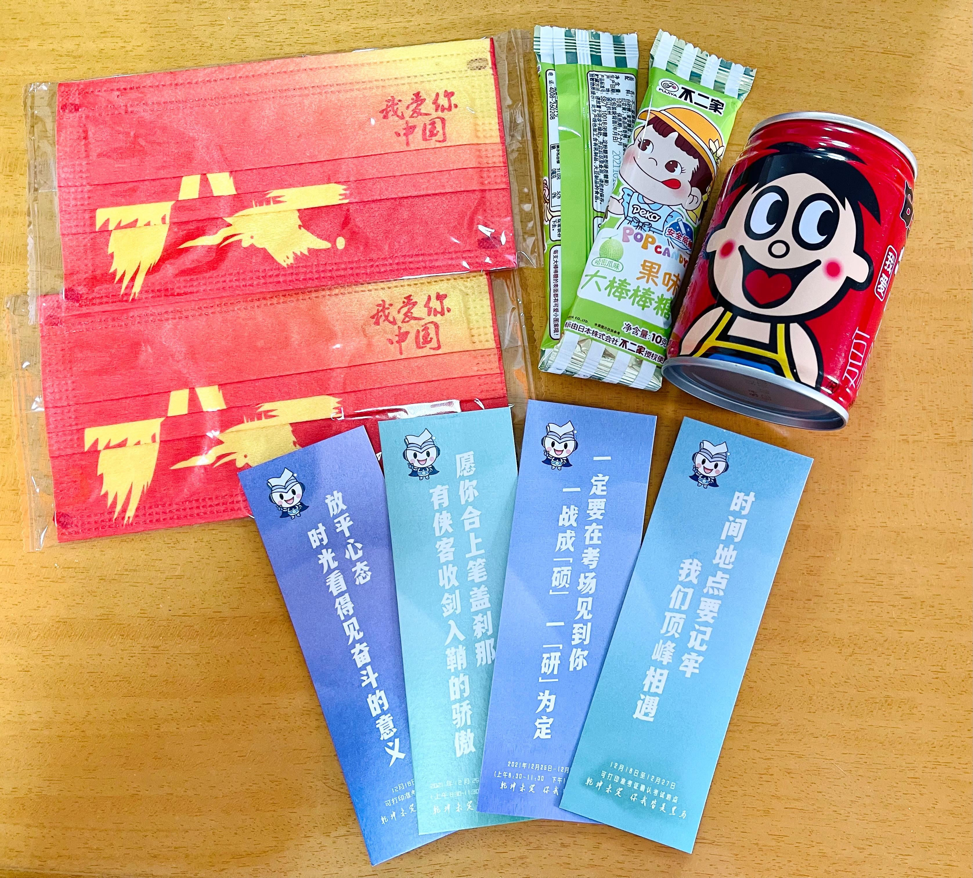 活动伊始,陈春锋书记向全体考研学生表达了关切之情,她鼓励同学们咬紧牙关,坚守初心、全力拼搏、不留遗憾,她还提醒同学们复习备考的同时要注意适当锻炼,加强营养,劳逸结合,保持身心健康。随后,赵芳老师代表学院为同学们赠送了“考研大礼包”,中国红口罩寓意“红红火火”,旺仔牛奶寓意“诸事旺旺”,棒棒糖寓意“棒上加棒”,定制书签上印有打印准考证时间、考试时间等考试相关信息,提醒同学们不要忘记关键时间节点。