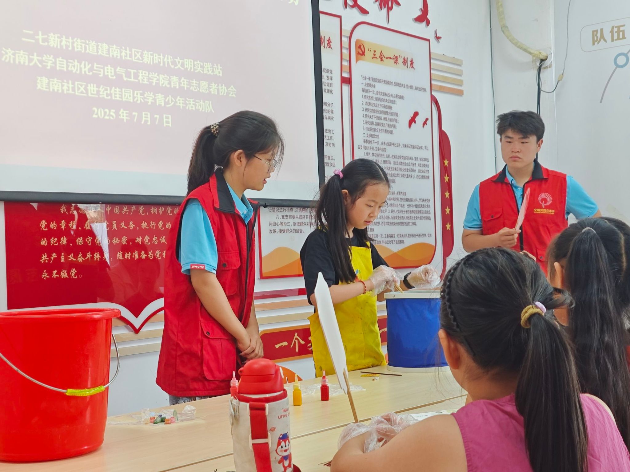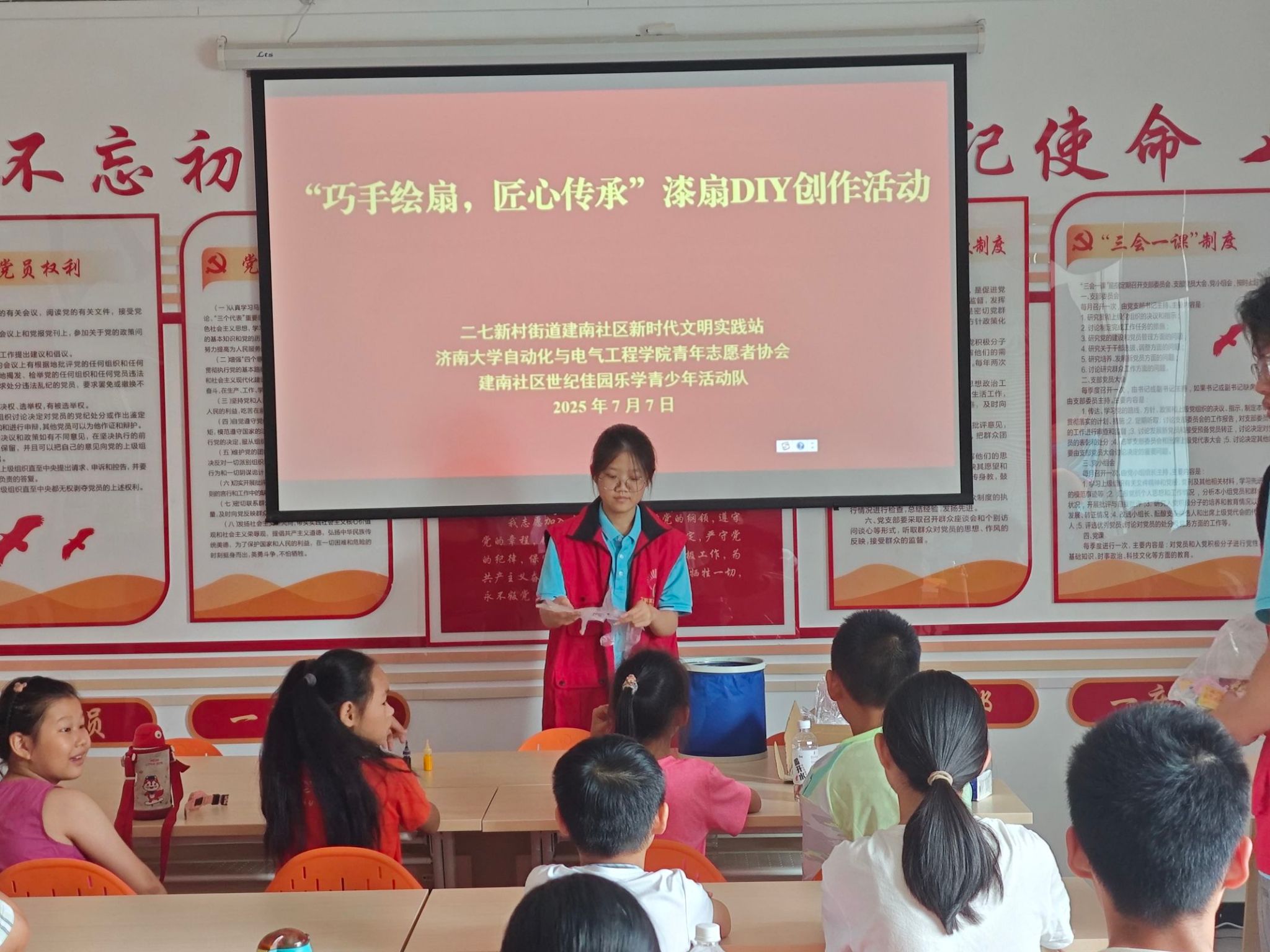 为传承中华优秀传统文化,增强青少年文化自信,7月7日,济南大学自动化与电气工程学院青年志愿者协会联合二七新村街道建南社区新时代文明实践站、建南社区世纪佳园乐学青少年活动队,共同开展了“巧手绘扇,匠心传承”漆扇DIY暑期三下乡社会实践活动,为社区的同学们带来了一场兼具知识性与趣味性的文化体验。