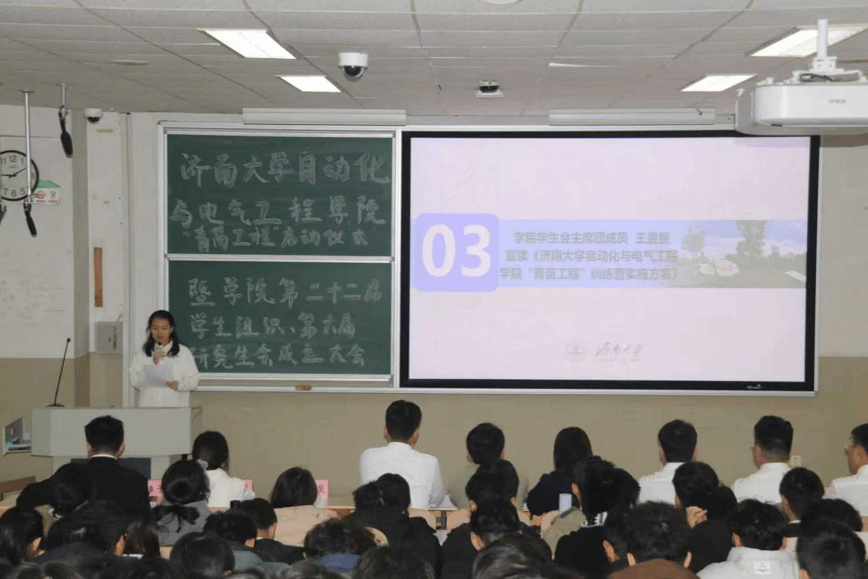 大会伊始,全体参会人员肃立奏唱国歌,庄重旋律凝聚起青春奋进的共识;随后共同观看短片《青春在拼搏奋斗中闪光》,鲜活的青春事迹激励在场学子以奋斗践行使命、以实干书写担当。会上,学院学生会主席团成员王昱斐宣读《济南大学自动化与电气工程学院“青苗工程”训练营实施方案》,明确训练营将围绕“政、科、志、文、学”五维砺才,辐射不同年级与群体,助力学生综合素养与核心能力全面跃升。