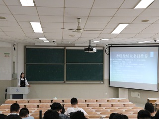 本次活动邀请到了2017级在本次考研中成功上岸的王炀和李瑞凤两位同学。王炀同学在本次考研中成功考取江南大学。首先他用互动的形式开场,给同学们讲了有关考研的基本知识,然后他还提到,每位要考研的同学都需要提早准备,做好自己的考研规划,最后他不忘强调,每一个要考研的学子都应提前树立目标,寻找一个适合自己的目标并为之奋斗努力。李瑞凤同学在本次考试中成功考取浙江大学。她在讲话中提到,考研最重要的是心态,无论临场发生了什么事情都要调整好自己的心态,快速恢复正常状态以免影响正常考试发挥,此外,她还为同学们推荐了有关考研的相关材料,让同学们少走弯路,进而提高同学们的复习效率。