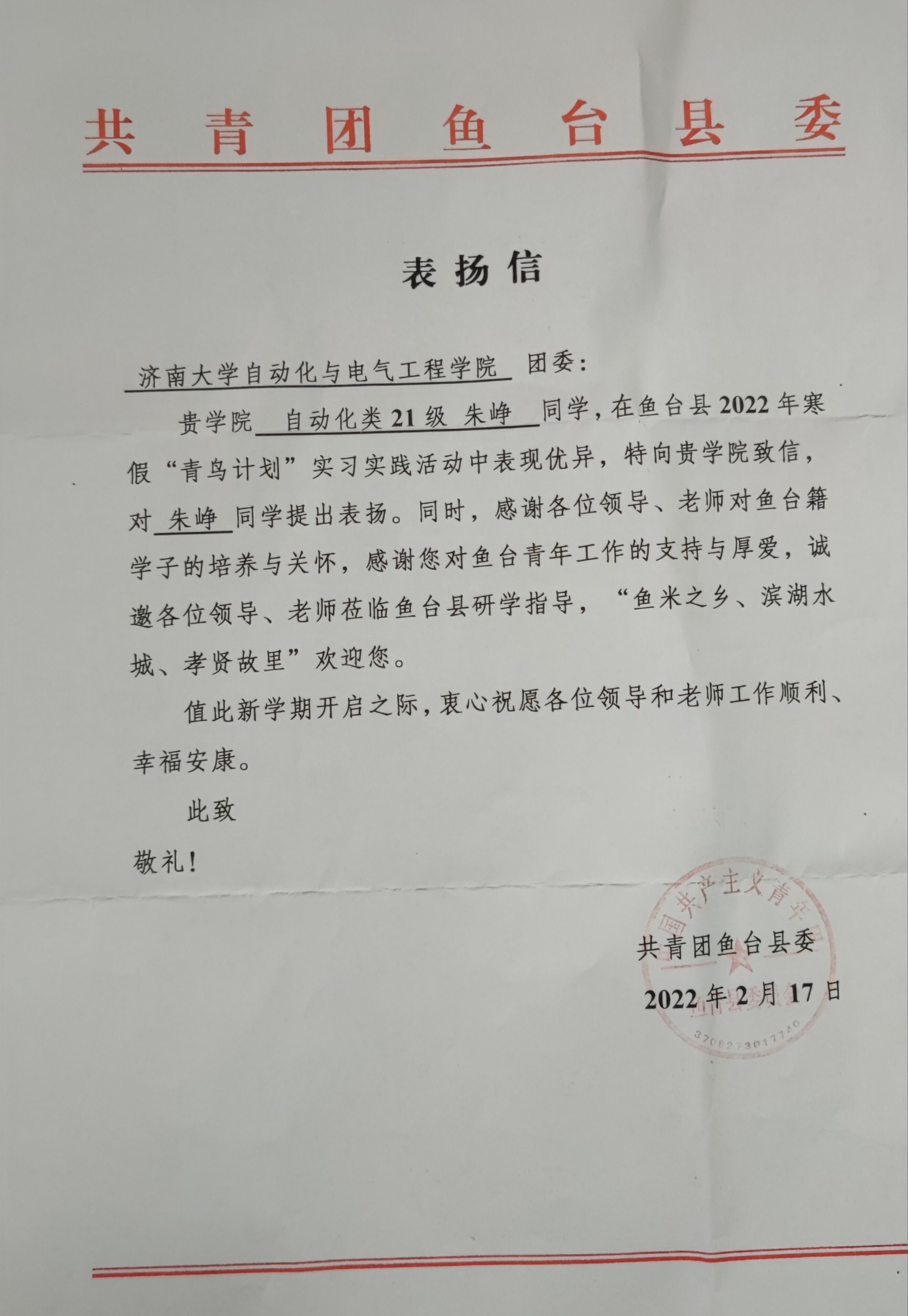 自动化类21级朱峥同学在鱼台县2022年寒假“青鸟计划”实习实践活动中的优异表现向学院致信并提出表扬,肯定了朱峥同学的表现以及洗澡偷拍