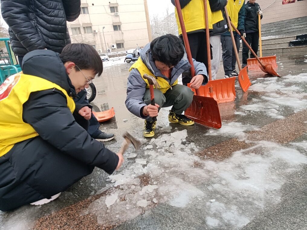 由于气温较低,人行道上的雪被压得很瓷实,有一些还结了冰,清扫工作十分困难,但是志愿者们不顾严寒,纷纷拿着扫雪工具,集中对第一教学楼、第二教学楼广场上的积雪集中进行全面清理。大家齐心协力,配合默契,为过往车辆和同学们安全出行提供了有力保障。对于难以清理的冰块,志愿者们借来了锤子进行破冰,冰花飞溅的同时大大提升了工作效率。迎着风,踏着雪,严寒丝毫没有影响大家清理积雪的热情。在志愿者们的共同努力下,白色的雪地中开辟出了一条条道路,为大家安全出行筑起温暖的屏障。