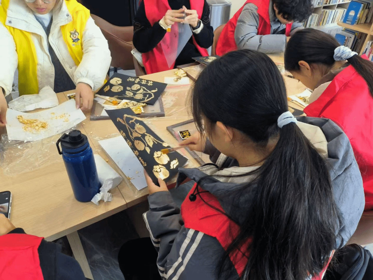 随后,志愿者们积极参与整理图书、制作非遗金箔画等活动,交流在实践中收获的思想,拓展其社会实践的深度与广度。在活动中,青年志愿者们展现了极高的热情和积极性,展现了新时代青年在团队协作中的责任担当和解决实际问题的能力。