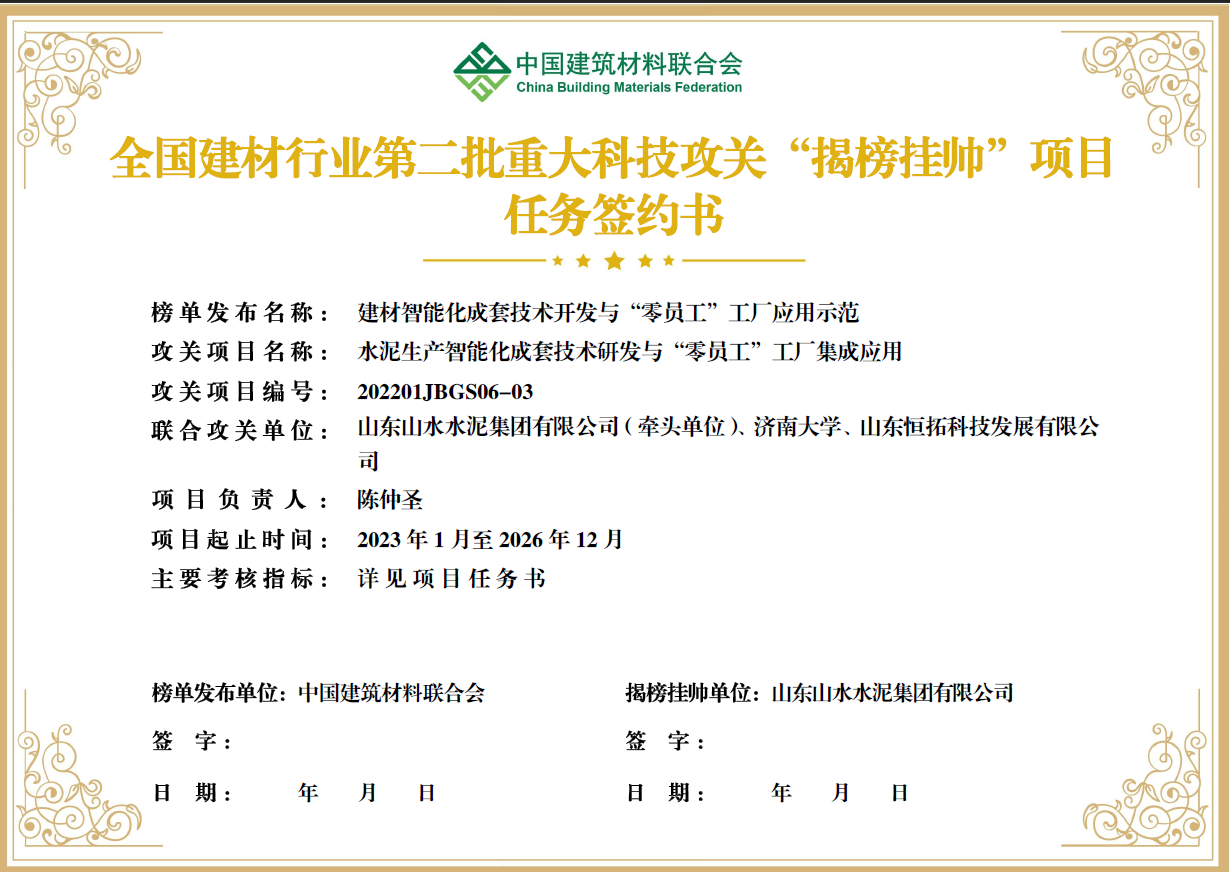 大会同步举行了第二批全国建材行业重大科技攻关“揭榜挂帅”项目签约仪式。我院王孝红教授团队成功揭榜项目2项,分别是与唐山冀东水泥股份有限公司联合的“建材智能化成套技术开发与‘零员工’工厂应用示范”,与山东山水水泥集团有限公司联合的“水泥生产智能化成套技术研发与‘零员工’工厂集成应用”项目。
