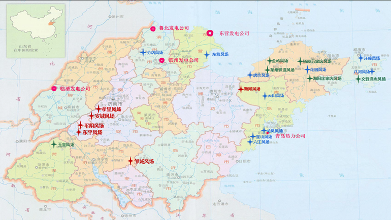 公司总部设在济南,青岛、烟台分设区域运营中心。公司项目分布山东省内11个地市(济南、青岛、烟台、威海、潍坊、济宁、泰安、东营、滨州、临沂、菏泽),拥有22个在役风电场(汪疃、八河、文登、栖霞、花园、海阳、金岭、莱州、唐珍、新河、云山、龙凤、宝山、六汪、东营、阳信、孝里、安城、平阴、东平、邹城、菏泽)和多个开发项目。
