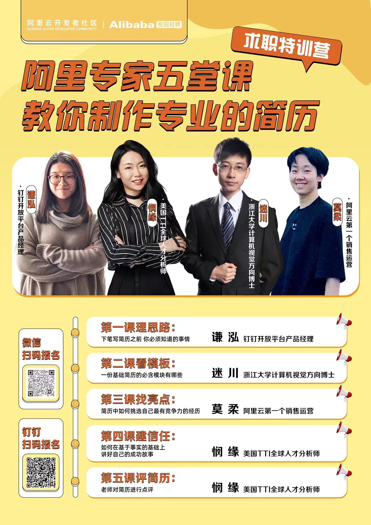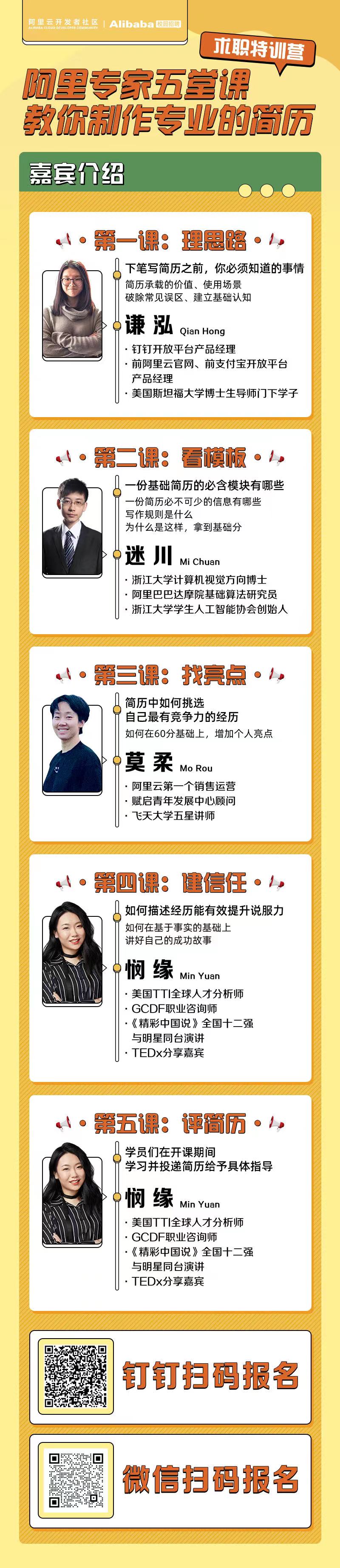 阿里云开发者社区联合阿里巴巴校园招聘举办“求职特训营”,邀请四位阿里专家倾情传授简历秘籍,深挖简历承载的价值,从面试官的角度切入讲解简历必含模块,更有资深专家直播在线答疑帮你修改简历!金三银四求职季,阿里专家助力你的求职之路!