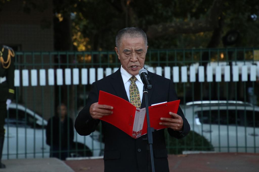 仪式开始,《义勇军进行曲》响起,国旗队进行庄严的升旗仪式。我院学生激情澎湃,热情高涨,高亢骊歌。随后,学生代表上前发言,先对校友回母校探望的爱校表示热烈欢迎与感谢,又以肺腑之言感谢学校的悉心栽培、号召同学们务必学业勤勉以回报母校。而后,各界代表及校友进行讲话。其中,我院前书记、校友代表范平上台慷慨陈词,先对母校献上诚挚祝福,后对我院众领导、学子表示慰问,并为其他学子建以良言,其言善也,真情酌句,令我院学子心中阵阵暖流,亦赢得阵阵掌声。而后,在场众院师生齐唱济大校歌,当“青龙山麓,白露飞翔”声乐一起之时,更是引发众人心中爱校忱忱之心,随之仪式落下帷幕。